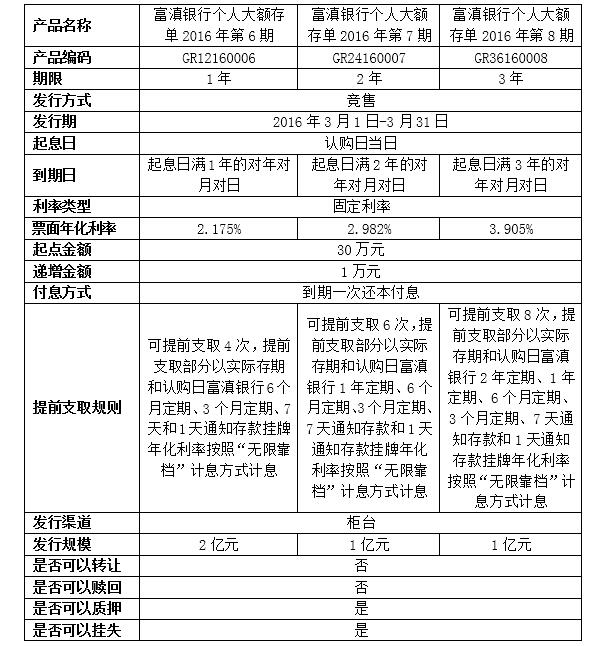 我行定于2016年3月 1日 至 3月 31日发行个人大额存单2016年第6期、第7期、第8期产品,产品具体信息如下:
