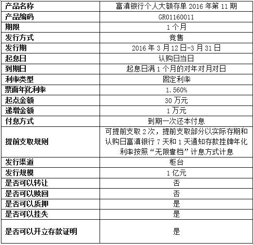 我行定于2016年3月12日至3月31日发行个人大额存单2016年第11期产品,产品具体信息如下: