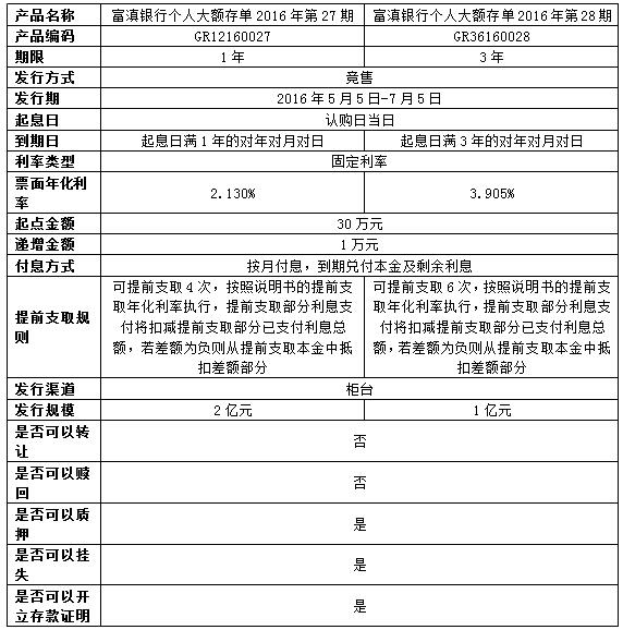 我行定于2016年5月5日至7月5日发行个人大额存单2016年第27、28期产品,产品具体信息如下: