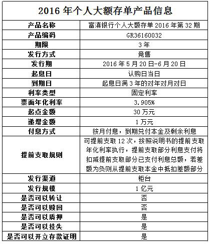 我行定于2016年5月20日至6月20日发行个人大额存单2016年第32期产品,产品具体信息如下: