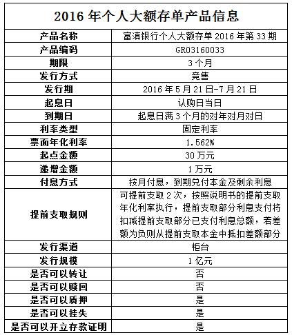 我行定于2016年5月21日至7月21日发行个人大额存单2016年第33期产品,产品具体信息如下: