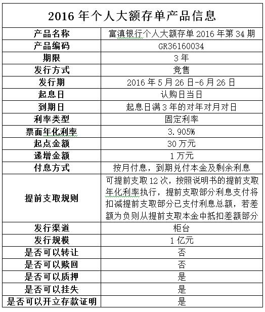 我行定于2016年5月26日至6月26日发行个人大额存单2016年第34期产品,产品具体信息如下:
