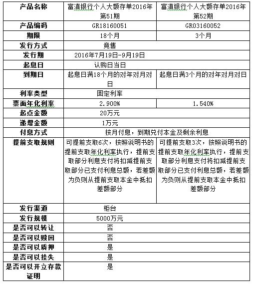 我行定于2016年7月19日至9月19日发行个人大额存单2016年第51、52期产品,产品具体信息如下: