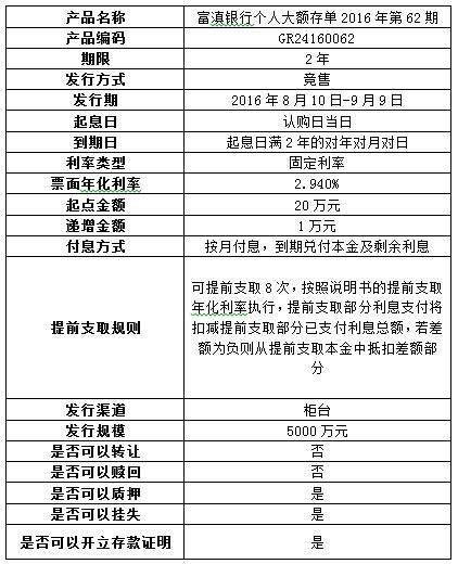 我行定于2016年8月10日至9月9日发行个人大额存单2016年第62期产品,产品具体信息如下: