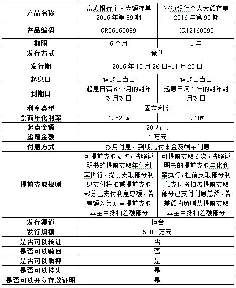 我行定于2016年10月26日至11月25发行个人大额存单2016年第89、90期产品,产品具体信息如下: