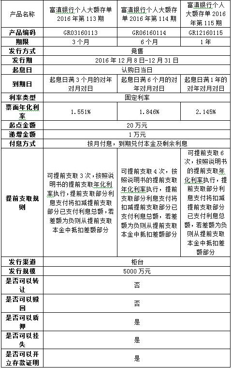 我行定于2016年12月8日至12月31日发行个人大额存单2016年第113、114、115期产品,产品具体信息如下: