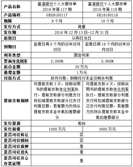 我行定于2016年12月13日至12月31日发行个人大额存单2016年第117、118期产品,产品具体信息如下: