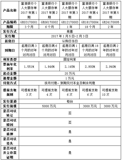 我行定于2017年1月5日至2月3日发行个人大额存单2017年第1至5期产品,产品具体信息如下: