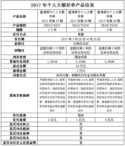 我行定于2017年3月20日至4月20日发行个人大额存单2017年第37至39期产品,产品具体信息如下:
