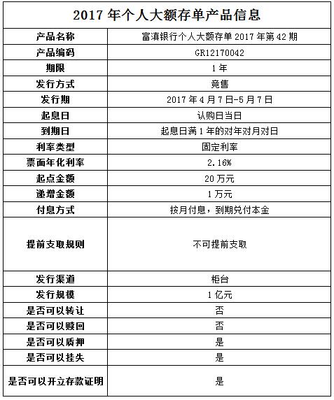 我行定于2017年4月7日至5月7日发行个人大额存单2017年第42期产品,产品具体信息如下: