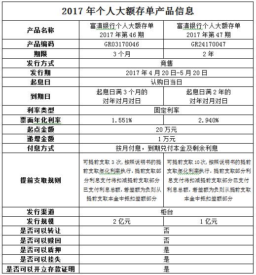 我行定于2017年4月20日至5月20日发行个人大额存单2017年第46、47期产品,产品具体信息如下: