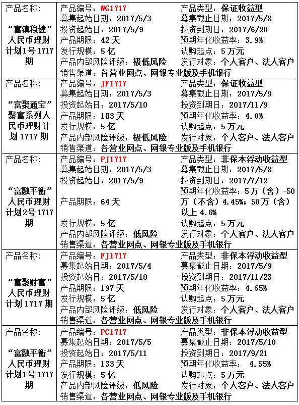 我行2017年5月2日-2017年5月5日理财产品发行计划公布如下,供您参考,欢迎致电富滇银行客户服务热线(0871-96533)或富滇银行各营业网点了解详情。