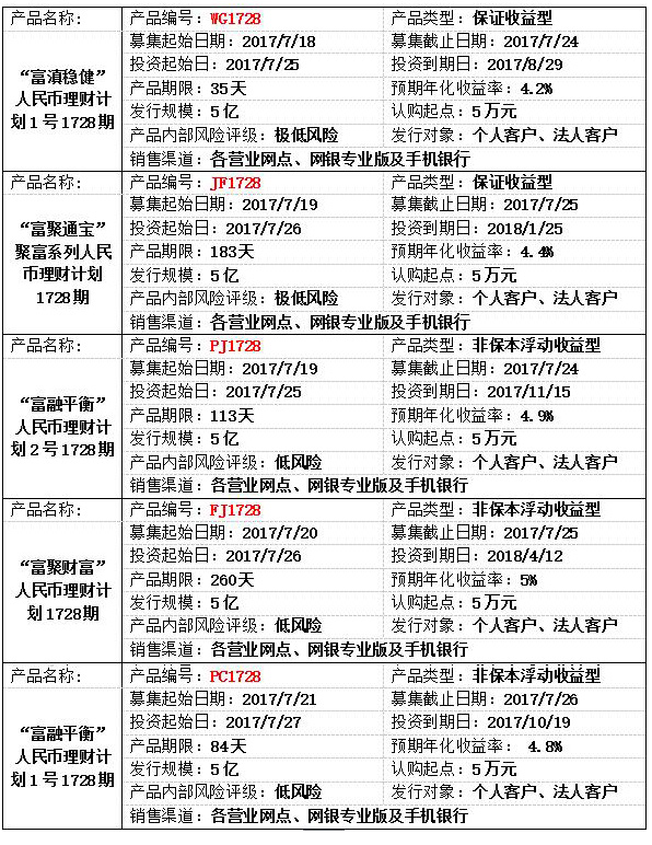我行2017年7月10日-2017年7月14日理财产品发行计划公布如下,供您参考,欢迎致电富滇银行客户服务热线(0871-96533)或富滇银行各营业网点了解详情。