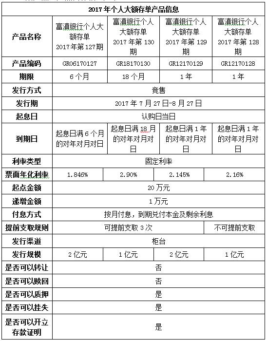 富滇银行个人大额存单 2017年第127至130期产品发行公告