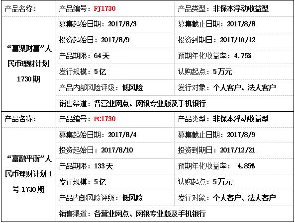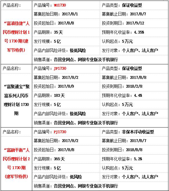 我行2017年7月31日-2017年8月4日理财产品发行计划公布如下,供您参考,欢迎致电富滇银行客户服务热线(0871-96533)或富滇银行各营业网点了解详情。