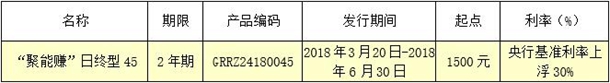 我行定于2018年3月20日至2018年6月30日发行“聚能赚”日终型45期产品,具体信息如下: