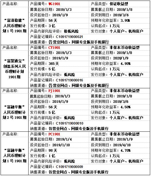 我行2019年1月2日-2019年1月4日理财产品发行计划公布如下,供您参考,欢迎致电富滇银行客户服务热线(0871-96533)或富滇银行各营业网点了解详情。