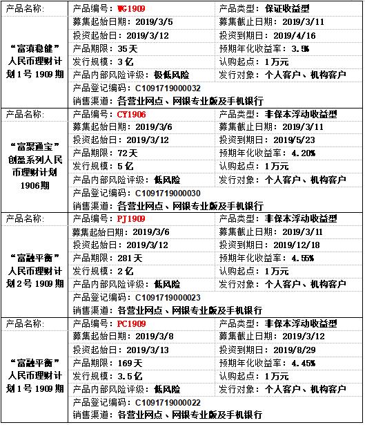 我行2019年3月4日-2019年3月8日理财产品发行计划公布如下,供您参考,欢迎致电富滇银行客户服务热线(0871-96533)或富滇银行各营业网点了解详情。