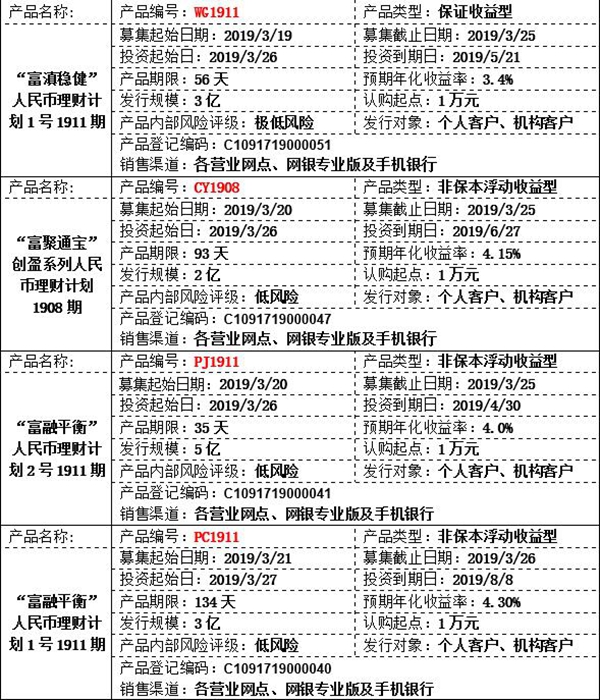 我行2019年3月18日-2019年3月22日理财产品发行计划公布如下,供您参考,欢迎致电富滇银行客户服务热线(0871-96533)或富滇银行各营业网点了解详情。