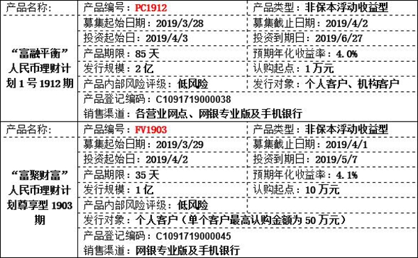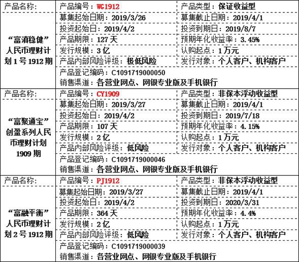 我行2019年3月25日-2019年3月29日理财产品发行计划公布如下,供您参考,欢迎致电富滇银行客户服务热线(0871-96533)或富滇银行各营业网点了解详情。