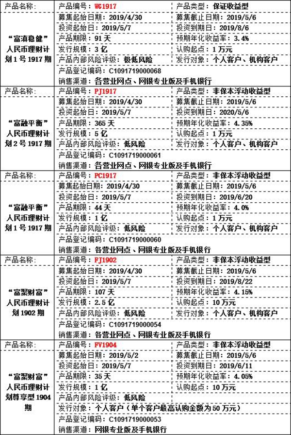 我行2019年4月28日-2019年5月3日理财产品发行计划公布如下,供您参考,欢迎致电富滇银行客户服务热线(0871-96533)或富滇银行各营业网点了解详情。