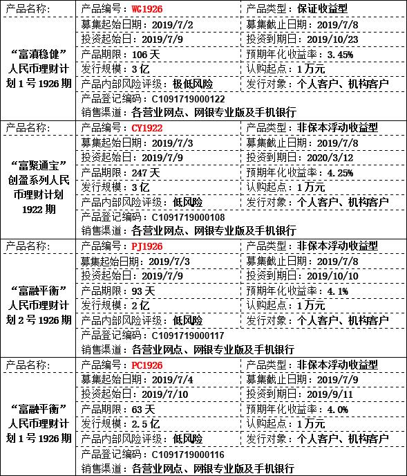 我行2019年7月1日-2019年7月5日理财产品发行计划公布如下,供您参考,欢迎致电富滇银行客户服务热线(0871-96533)或富滇银行各营业网点了解详情。