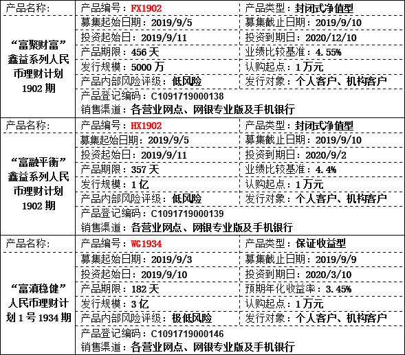 我行2019年9月2日-2019年9月6日理财产品发行计划公布如下,供您参考,欢迎致电富滇银行客户服务热线(0871-96533)或富滇银行各营业网点了解详情。