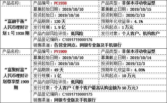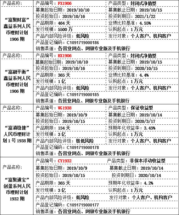 我行2019年10月8日-2019年10月12日理财产品发行计划公布如下,供您参考,欢迎致电富滇银行客户服务热线(0871-96533)或富滇银行各营业网点了解详情。