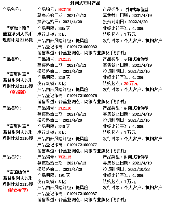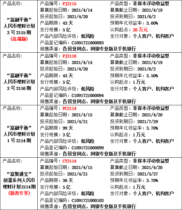 我行2021年4月12日-2021年4月16日理财产品发行计划公布如下,供您参考,欢迎致电富滇银行客户服务热线(0871-96533)或富滇银行各营业网点了解详情。