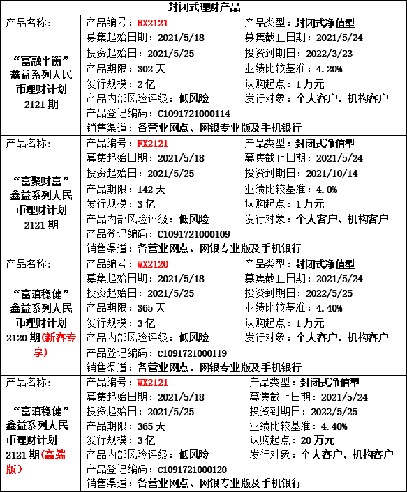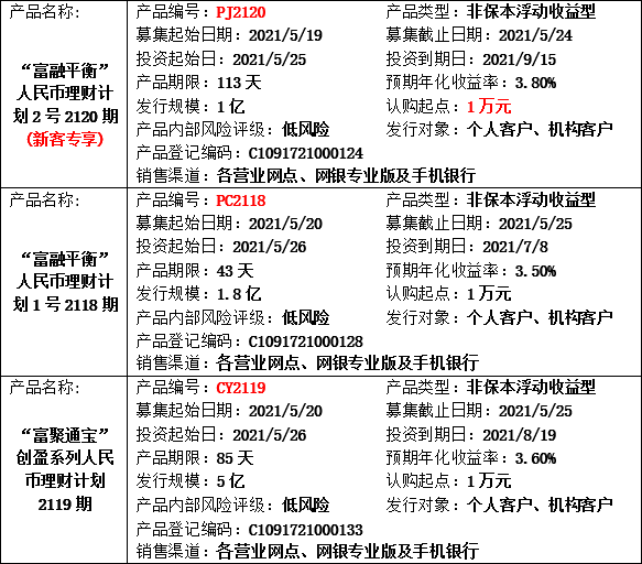 我行2021年5月17日-2021年5月21日理财产品发行计划公布如下,供您参考,欢迎致电富滇银行客户服务热线(0871-96533)或富滇银行各营业网点了解详情。